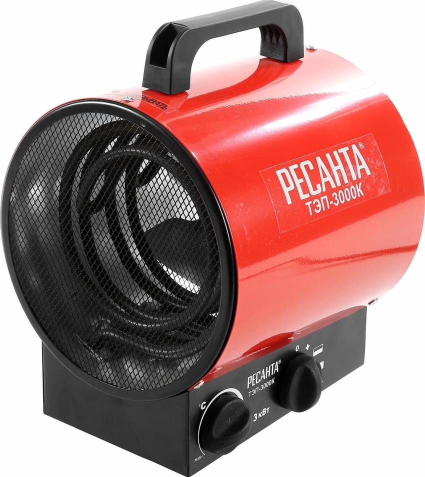 For heating garages and other non-residential premises, many consumers use the Resant TEP-3000K electric heat gun. For convenient transportation, a special handle is provided in the design, which allows you to carry the device to any convenient place. The heating element has a rounded shape and provides quick heating of air in the room to the required temperature.