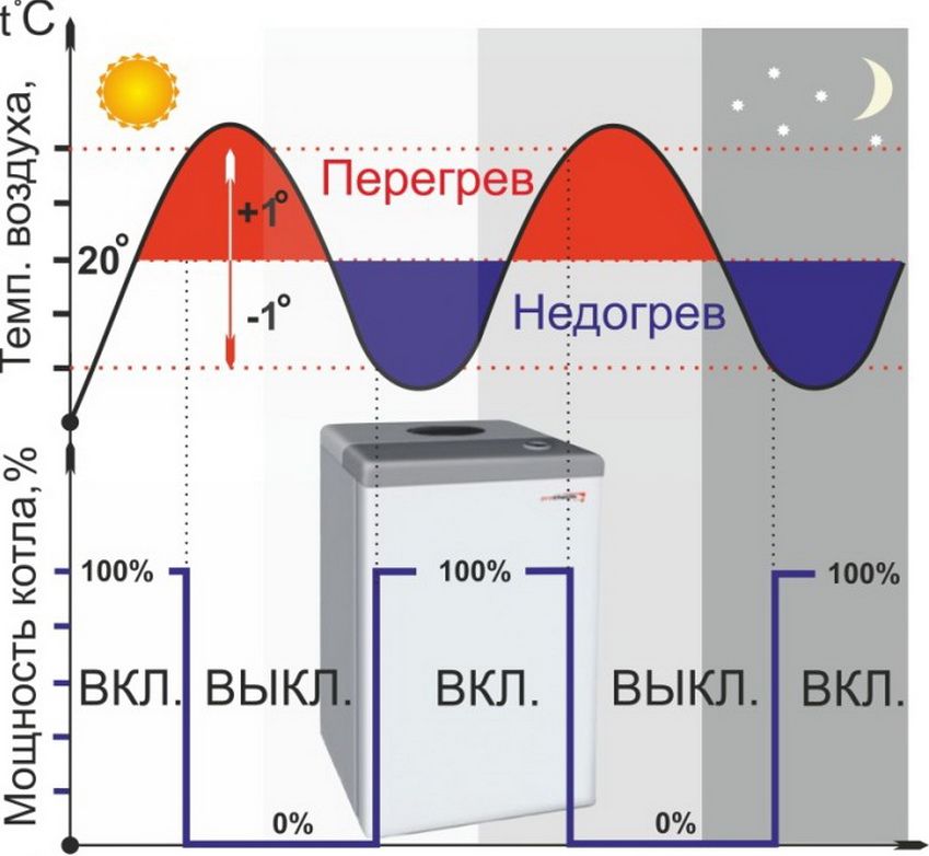 If we are talking about control using a thermostat for a gas boiler, then such a device sets the optimal mode for the unit, taking into account the air temperature in the heated room. If, for example, there was a sharp warming and the room received additional heat from the sun's rays, the thermostat will instantly react and give a signal to the control device to turn off the boiler.