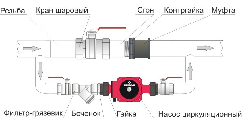 Houses with an area of more than 100 m2, equipped with a system of forced circulation of the coolant. The power of the boiler and pump depends on the heat load of the room, total heat loss, the number of heating circuits and devices. Traditionally, pumps are installed on the bypass of the return line, through which the cooled coolant returns to the boiler. Additionally, pressure is injected in the long-distance hot water system and independent low-temperature heating circuits for underfloor heating.
