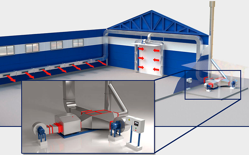 The air heating system of an industrial premises does not have significant differences from a similar method of heating a private house. The same heaters, heat generators, fans can be used. The only difference lies in the large size of the premises, which require corresponding equipment capacities.