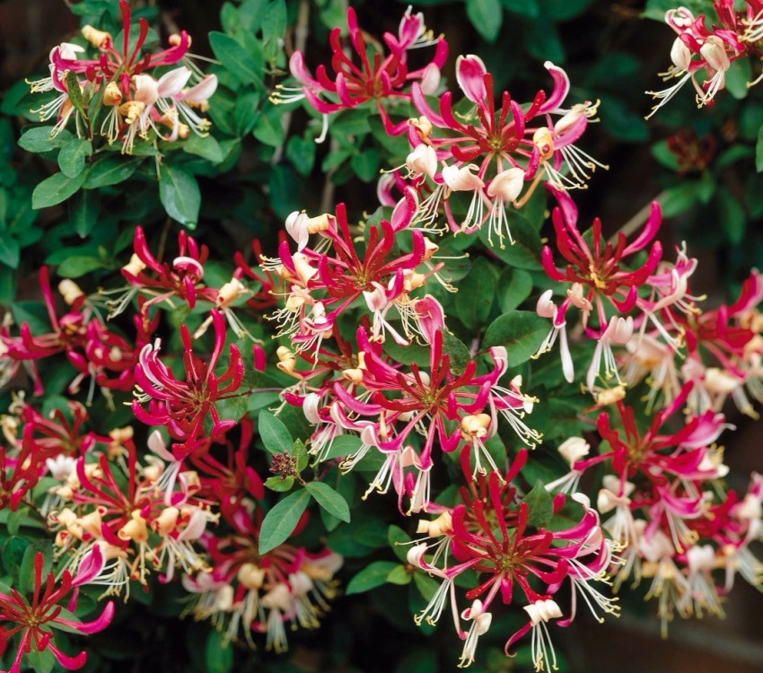 - Henry's honeysuckle is a relatively small (up to 2.5 m) liana that blooms incredibly beautifully: its bright flowers are collected in inflorescences and have an extremely pleasant aroma. The plant calmly tolerates shade or partial shade;