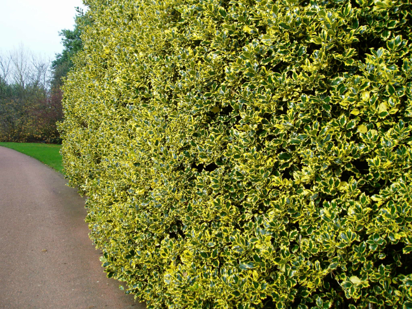 Holly is a shrub that has dark green foliage with a glossy finish. Its leaves are thorny, which makes it possible to create an almost impassable fence, the height of which can reach several meters. The plant is unpretentious and can fully grow and develop both in conditions of a sufficient amount of sunlight and in partial shade.