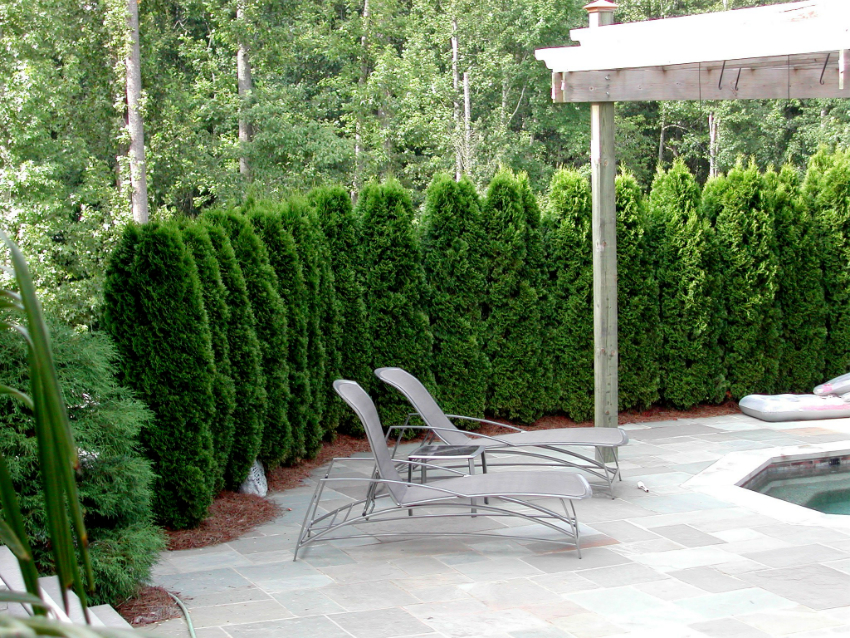 Having made a choice in favor of thuja for a hedge, it is worth considering another variety of this plant as an option. Thuja Smaragd can reach a height of 3-5 meters. Moreover, its girth will reach 2 m. Such serious dimensions of an adult plant should be taken into account in the process of planting seedlings, leaving a sufficient gap between them, even if in the end you want to get a dense green hedge.