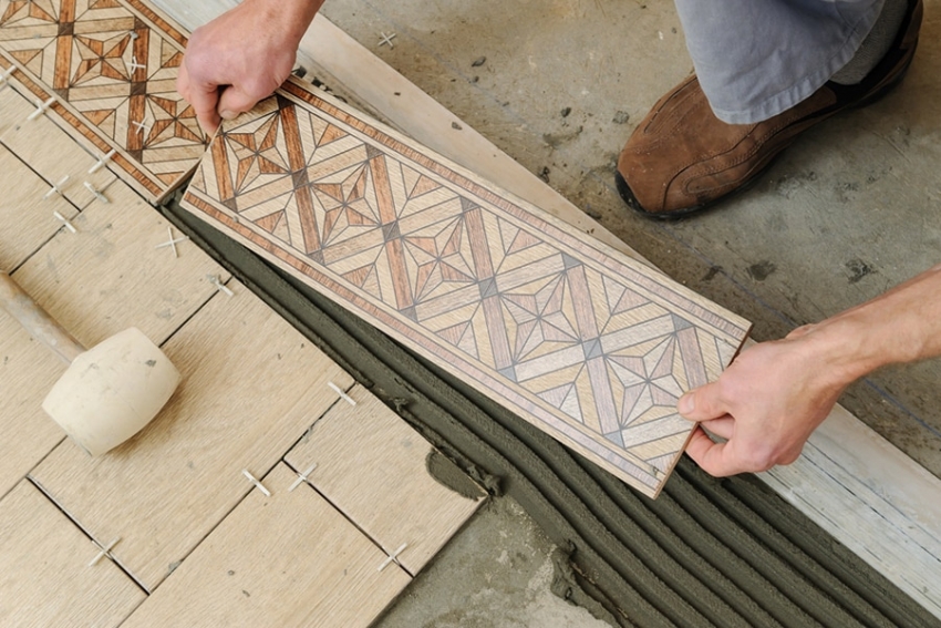 - for complex patterns, the tiles must be cut in advance and then laid out on the surface of the floor covered with a cloth to see the result before starting to apply the solution;