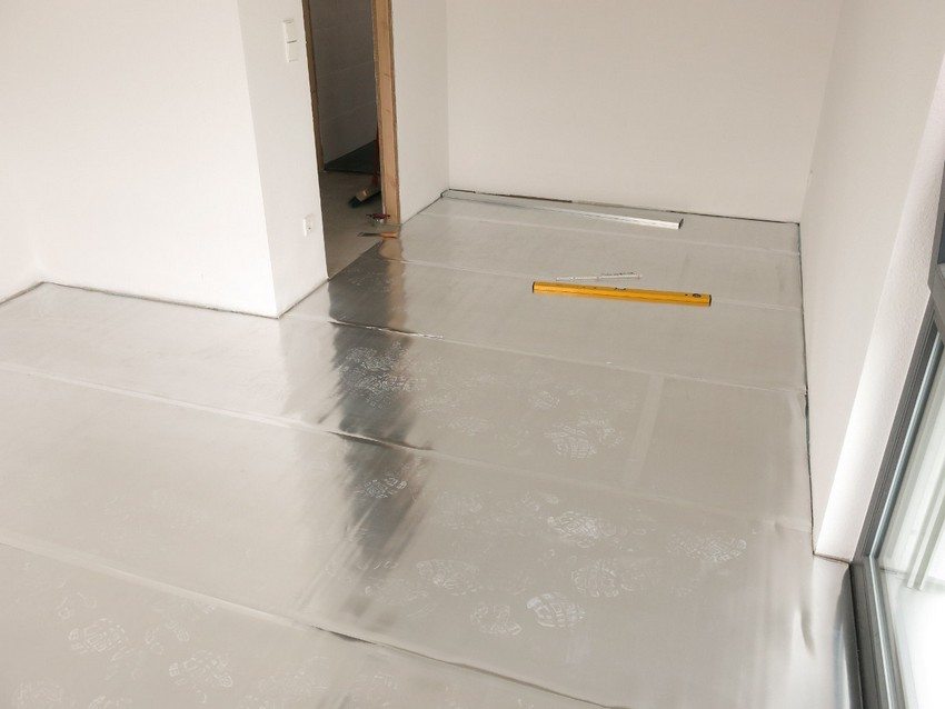 The floor in the room is covered with a foil backing and is completely ready for laminate installation