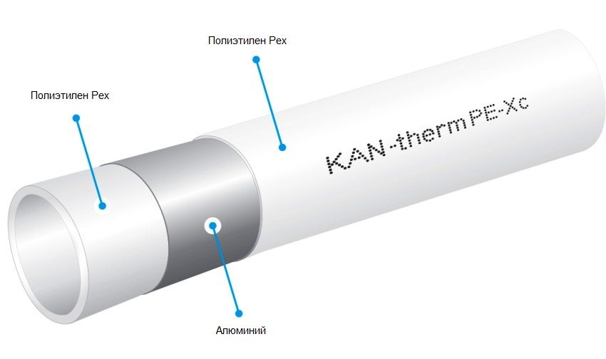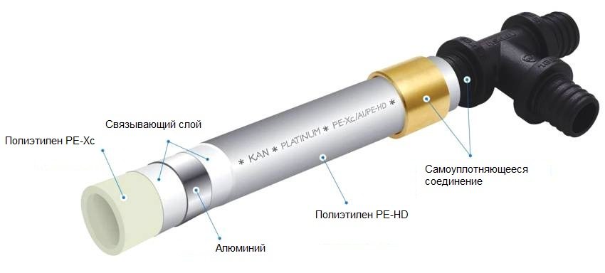 Reinforced plastic is a modern composite multilayer material. Outside and inside polyethylene of various thicknesses, an aluminum spacer connects them. Such pipes have optimal heat transfer per 1 m2, which gives good performance when heating the finish floor covering. The metal contributes to very fast heating and good heat capacity, and also provides the necessary strength to the product. The design features of the pipe determined the following properties required for it: