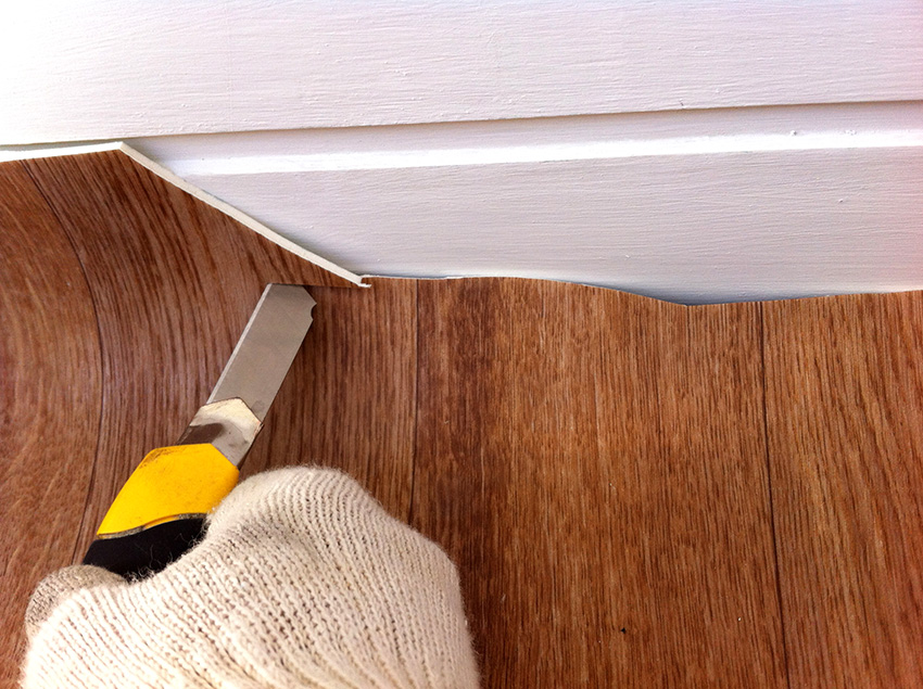 The next step is to dismantle the old skirting boards. At the same time, they check the evenness of the surface near the walls, prepare it for laying a new coating. In addition to linoleum, laminate and tiles can be laid on linoleum, but on one condition: the previous coating must be even, clean, without significant flaws.