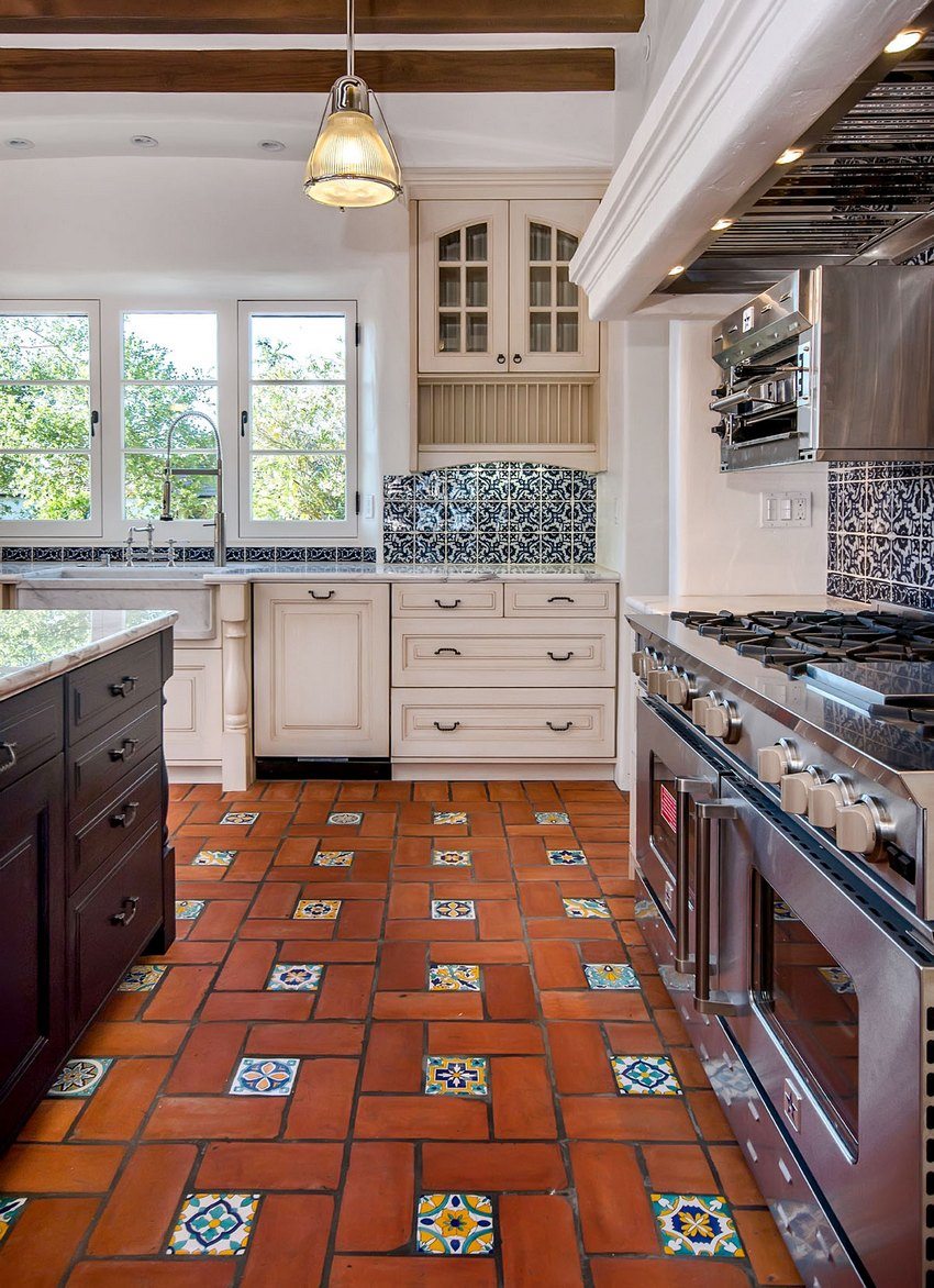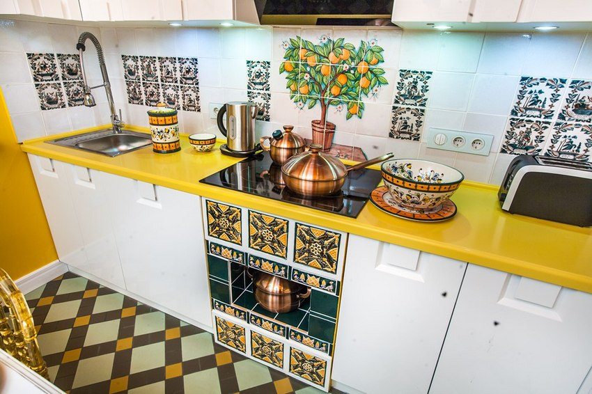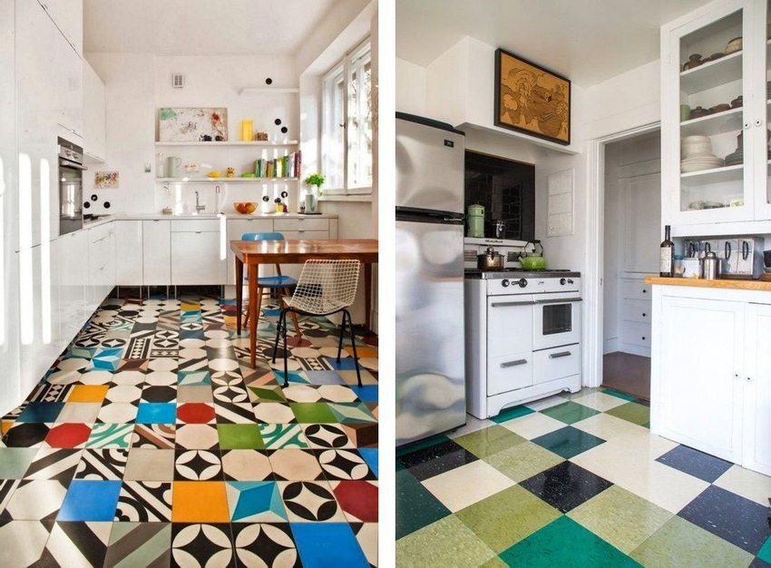 In modern kitchen interior used floor tiles of different sizes and colors