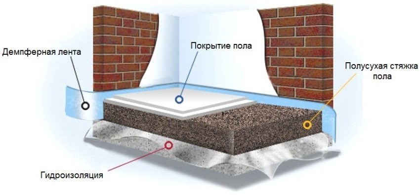 Knowing this, it is necessary to solve the problem of reducing the mass with a constant layer thickness. This can be done only by reducing the density of the entire monolith. The best material for this purpose is expanded clay, from which the pillow is made. On top of it, fall asleep and level the semi-dry mixture. The semi-dry mix base is floating. It is not rigidly fastened to either floor slabs or walls. The screed is separated from the floor with a layer of waterproofing, and from the walls with a damper tape along the entire perimeter. It also prevents the propagation of sound vibrations from the floor to the walls. This measure eliminates the cracking of the screed surface when the mortar dries.
