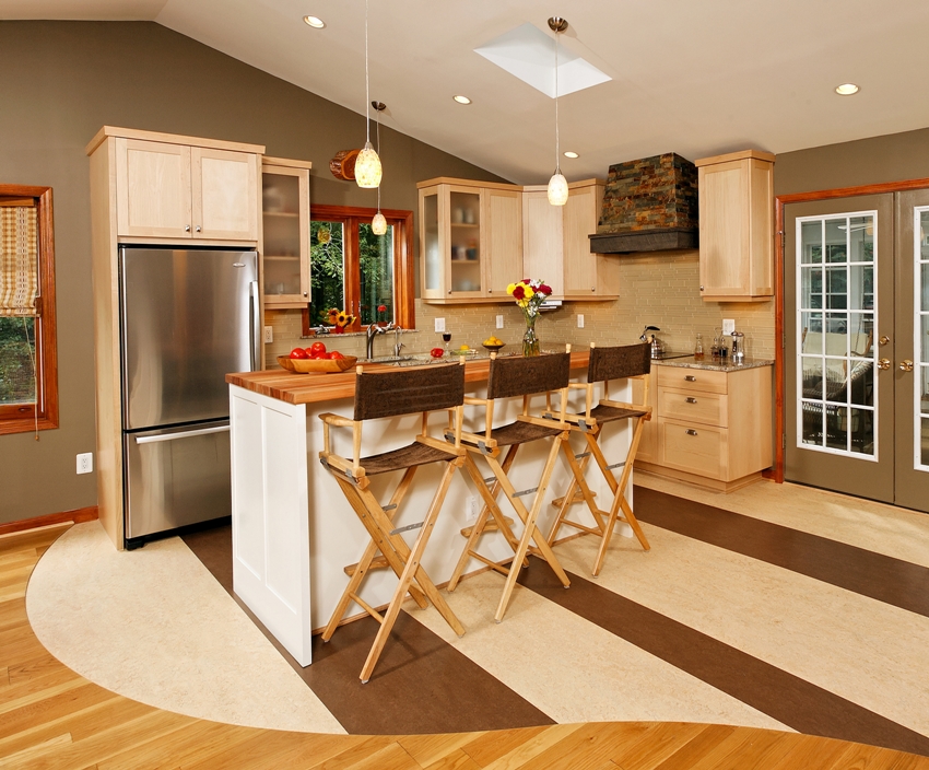 Often, designers offer to combine two floor coverings, depending on the functional area of the kitchen.