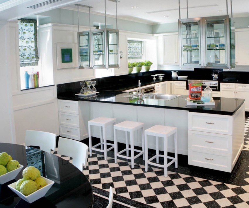 Manufacturers produce several types of ceramic tiles for the kitchen floor, the photos of the interior design clearly reflect this. Monocotture is represented by enamelled items. Due to the fact that a single firing of raw materials is used in the production of tiles, the coating is firmly connected to the bearing surface of the tile. This contributes to the creation of a material that is resistant to mechanical and chemical negative influences.