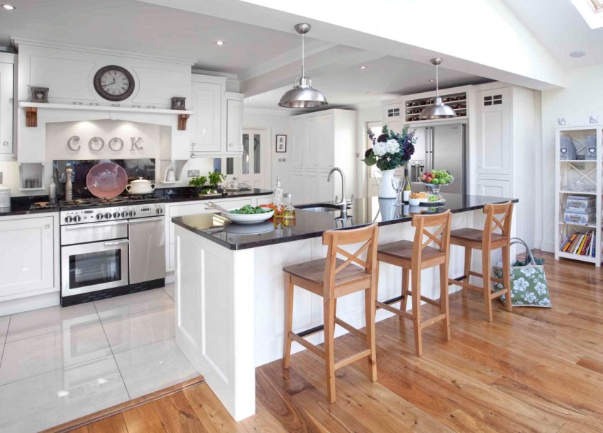 Ideal kitchen floors should be moisture resistant, easy to clean, have a solid surface and fit into the overall design