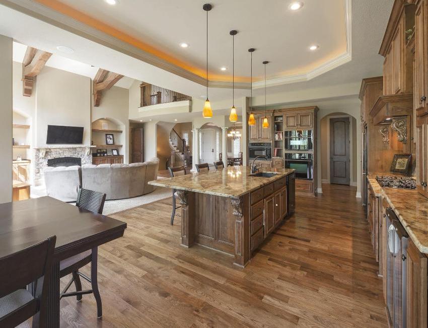 A good solution is to use two different decors or options for contrasting shades, with which you can zone the room. This is clearly shown in the photo of the floor in the kitchen-living room.