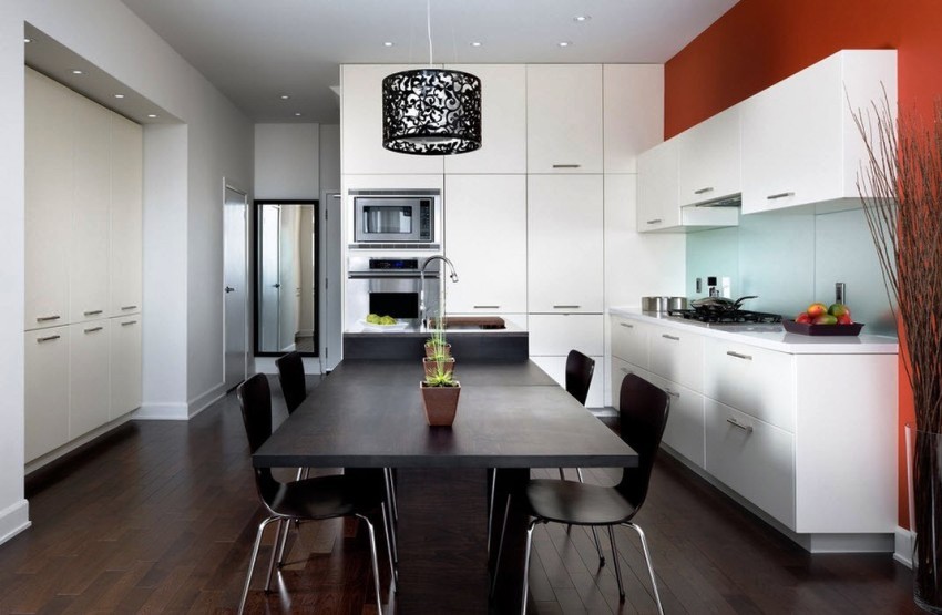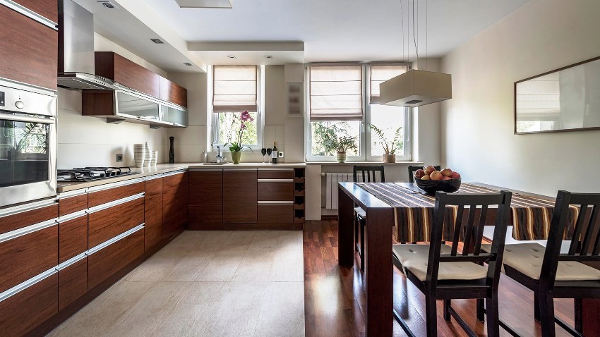 Laminate flooring can imitate all types of wood, including precious and exotic, so thanks to it you can make the interior of the kitchen unusual and original