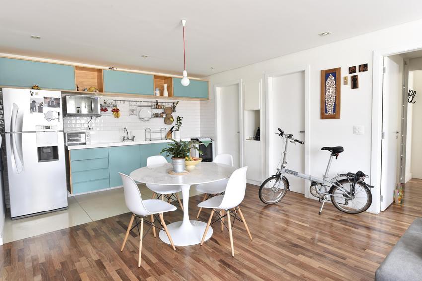 The working area of the kitchen floor is tiled with practical ceramics, and the dining area is lined with laminate