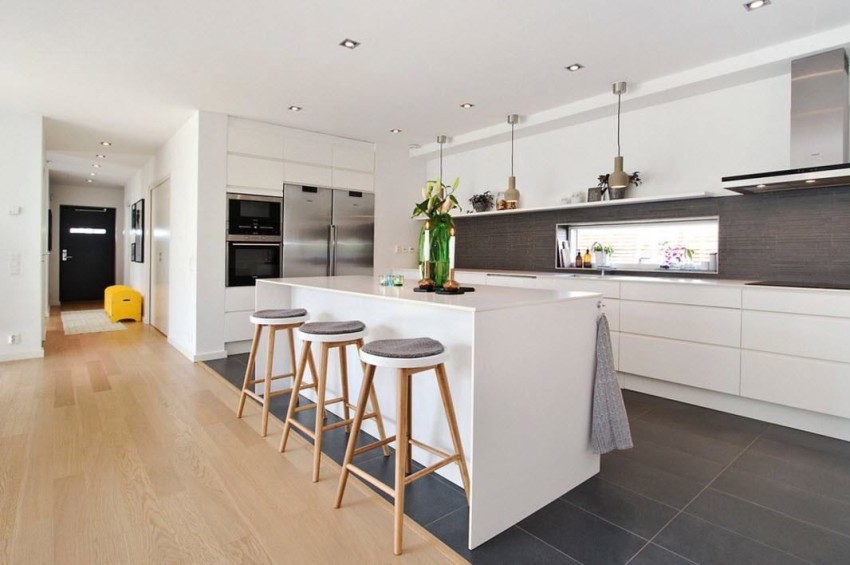 A harmonious combination of laminate flooring and porcelain stoneware tiles for the kitchen floor will look stylish, expensive and presentable, which should be located at the entrance to the room and in a place where water and grease can get into. Here it is better to give preference to a matte surface that does not slip, washes well and does not rub off.