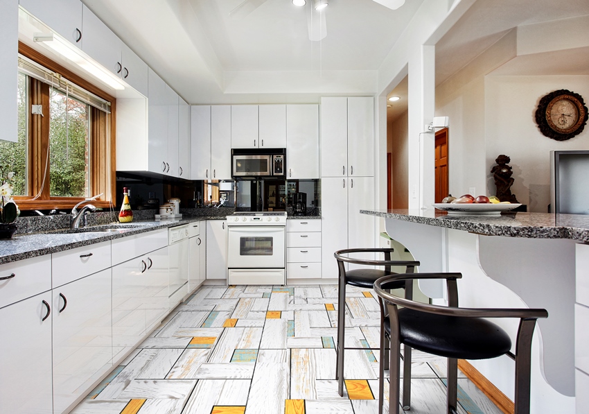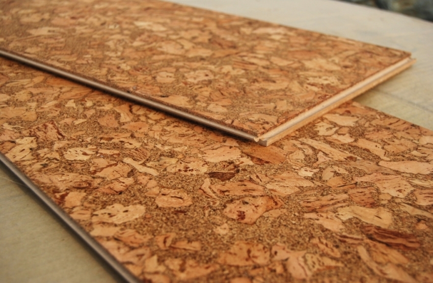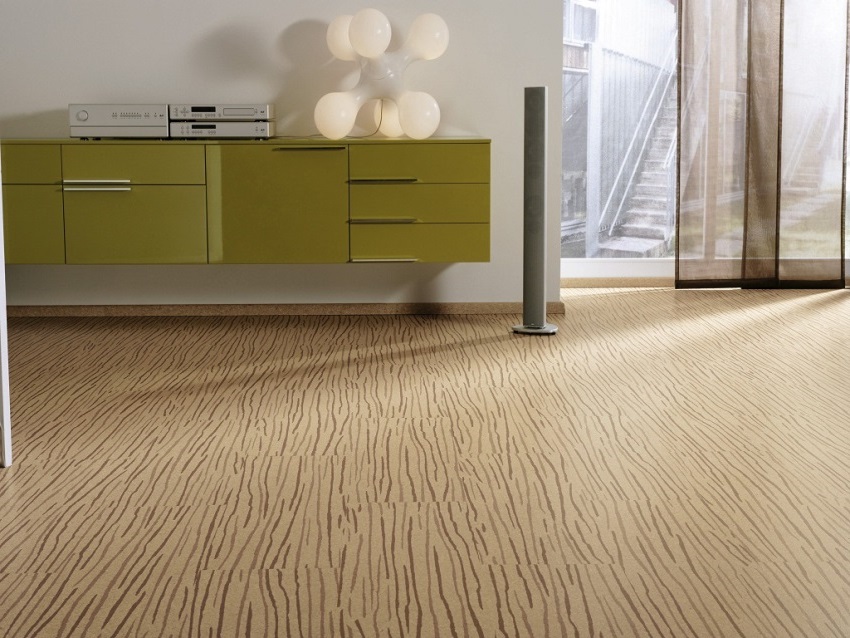 There is moisture resistant Cork board on the floor (laminate). The base in this material is a slab made of quartz and PVC.This type of coating has a higher price, while the choice of colors is limited.