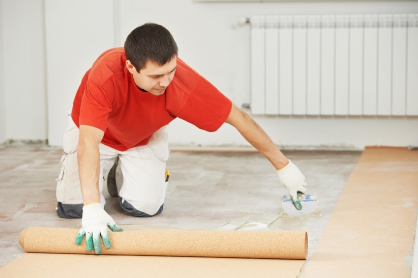 Cork reacts sensitively to moisture levels, contracting and expanding depending on room conditions. Therefore, before starting work, it is advisable to hold the packaging with the material for several days in the room where it will be laid. During this time, the humidity level stabilizes. A technical roll cork can be used as a substrate for the coating. The optimum thickness of this material is 2-3 mm. The wall should be retreated by 1.5 cm. The technical plug is laid on a waterproof film over the concrete screed.