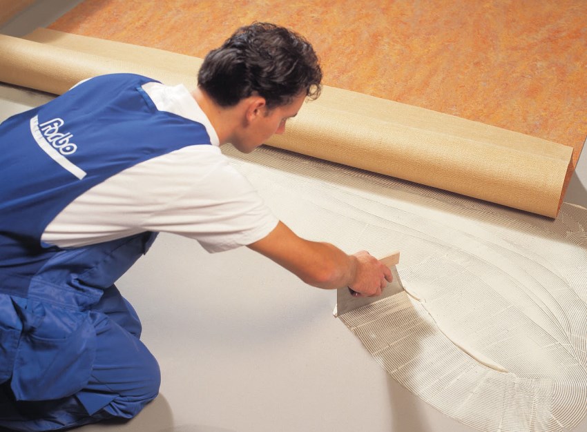 In this case, installation work should be started from the middle of the room. To simplify the process of laying the coating, it is advisable to apply markings on the surface of the base. A cord is suitable for this. An adhesive composition is prepared according to the instructions. It is applied to the board surface using a roller. After that, the element is pressed tightly against the base, previously greased with glue. Use a fine-toothed spatula to apply the composition.