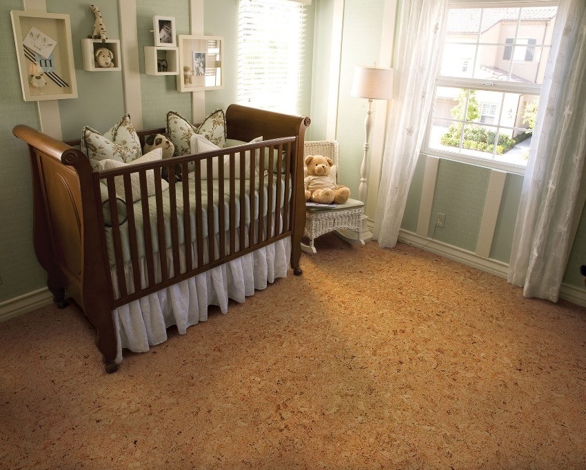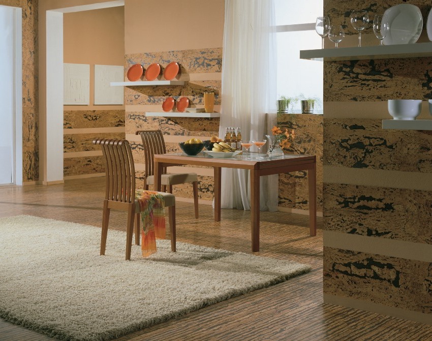 The surface of the cork is elastic and soft. Orthopedic specialists recommend using this type of decoration for people with diseases of the musculoskeletal system, as well as as a coating in children's rooms. The cork is safe and environmentally friendly. Its surface does not slip, does not absorb liquids and does not emit harmful substances. In addition, the material has antistatic properties. The cork does not need any difficult maintenance and perfectly repels dust.