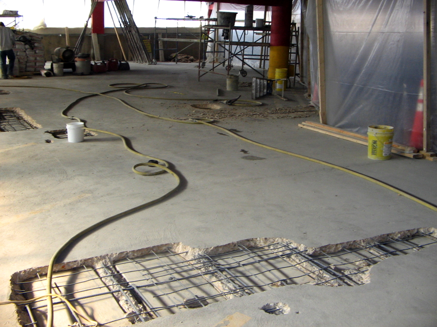 The cost of repairing an epoxy floor in cases of concrete backing problems will be quite high. The fact is that you cannot do with cosmetics. It is necessary to remove the polymer layer completely or even with part of the concrete screed. Sometimes a complete dismantling of the floor and base is required.