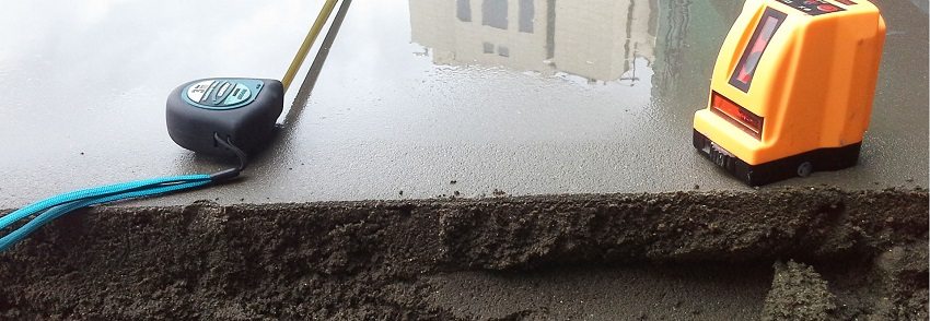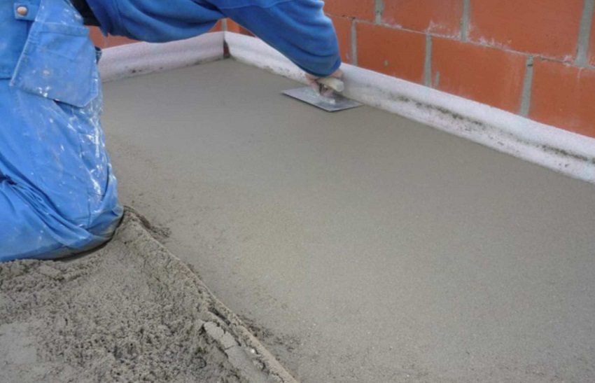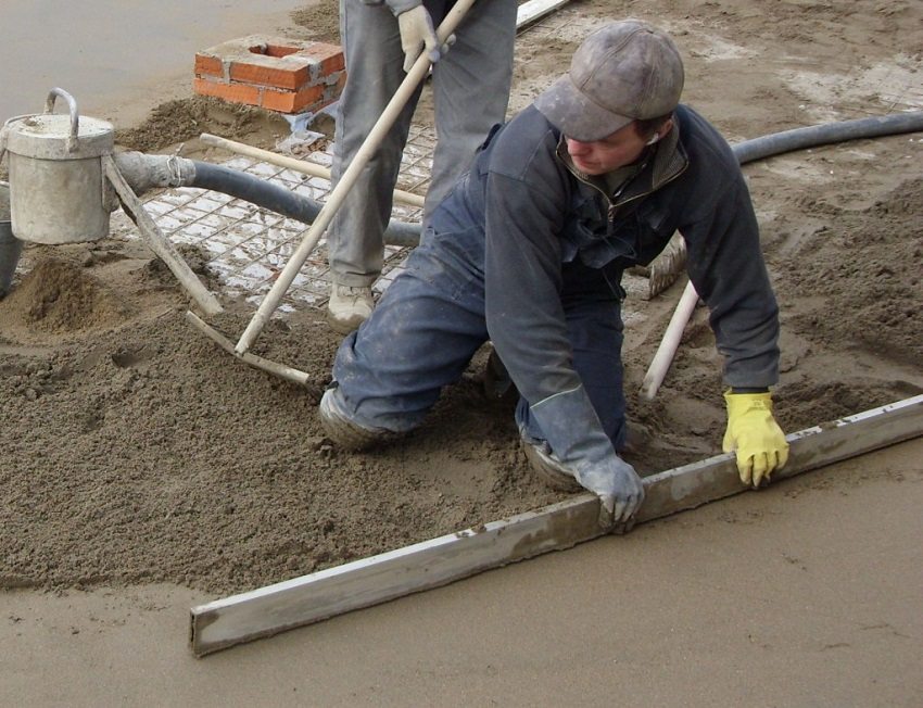 First, beacons are installed on the prepared base every meter parallel to each other. At this stage, you need to use a level. Then, the resulting niches are filled with a solution to the height of the lighthouses. For convenience, this is done through one niche. With a trowel and a rule, the solution is leveled along the upper edge of the guide beacons. After the screed is completely filled, it must be periodically moistened with water so that the cement does not crack. When it will be possible to walk freely on the surface, it is necessary to wipe the existing irregularities until a completely smooth surface is obtained. Complete hardening occurs after 28-30 days.