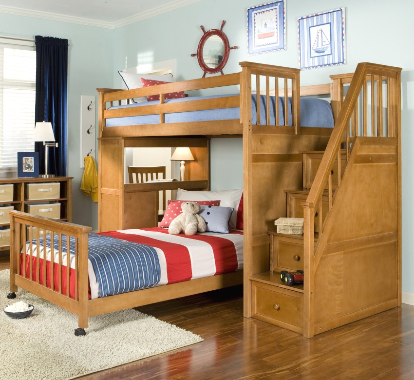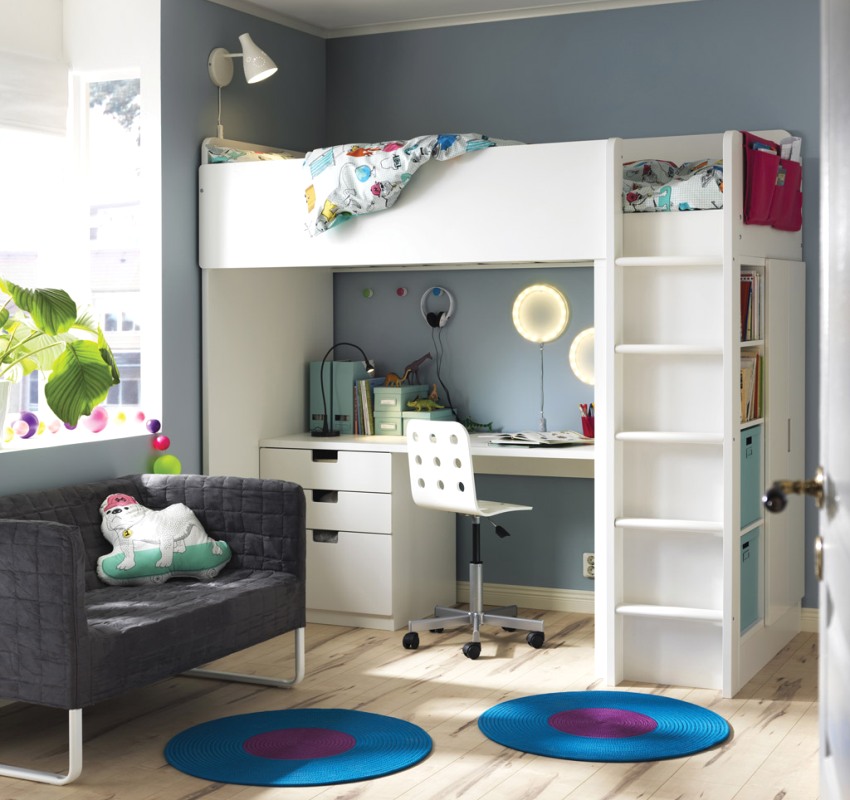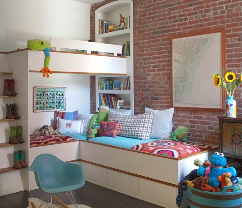 Almost perfect solution for everyone bunk bed... Significantly saves space and adds an element of entertainment for children of almost any age.It often happens that at the same time both babies express a desire to sleep on the second floor. Then you should pay attention to loft beds. The second floor will be used for sleeping, while the first floor will house a desk with additional shelves.