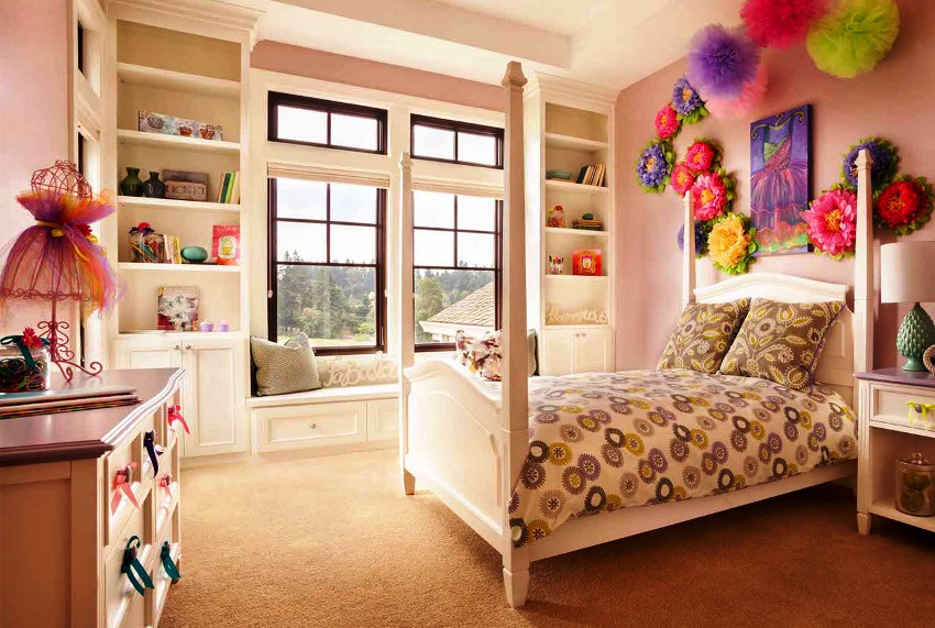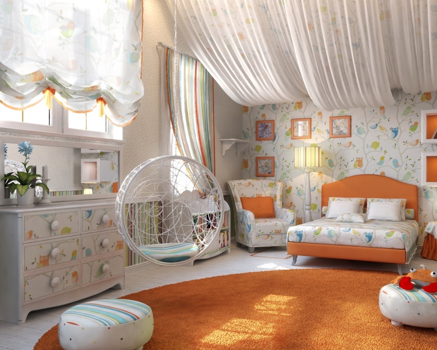 The girl can choose the wallpaper for the room on her own or stick interior stickers with the image of her favorite cartoon characters. In the children's room, special attention should be paid to the bed, which must be large. The right mood in the nursery is created with the right textiles.