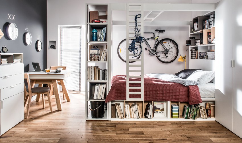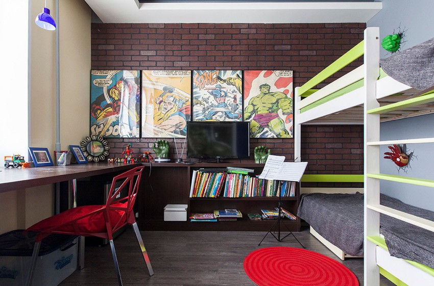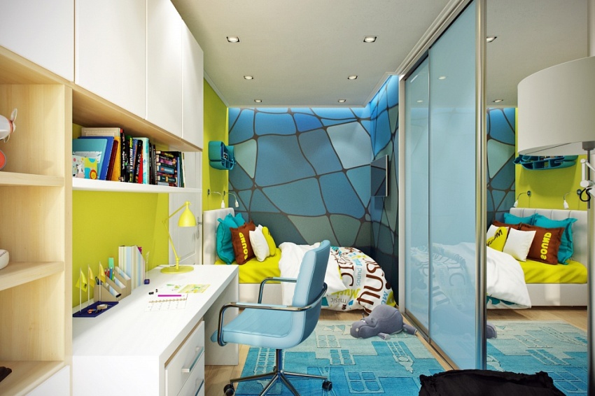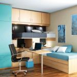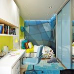 The older the boy is, the less furniture and accessories he needs. For example, in the photo of a bedroom for a teenage boy, you can see a space almost devoid of furniture, where there is only a desk and a folding sofa, which takes up a minimum of space. A good solution is the use of an attic bed, under which a full-fledged working area is organized. In this case, the free space is used depending on the needs of the child. As for the choice of color, you can use both light and dark shades.
