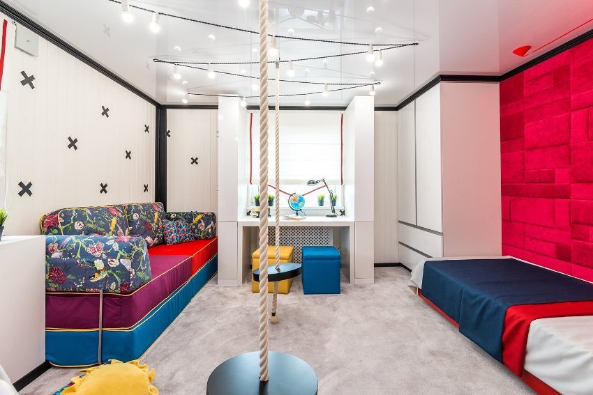 All children love it when stars are hung on the ceiling and glow in the dark. To instill a love of sports, it is recommended to install a wall bar with rings, stairs and a rope in a small child's room.