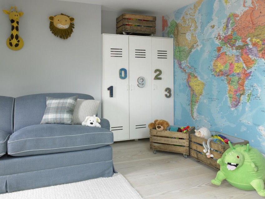 Many children are fond of traveling and exploring different countries. In this case, a geographical map of the world can be placed on one of the walls, and the interior can be supplemented with a globe. Such an idea will be both interesting and useful for the child. You can clearly see this decision in the photo of the design of a children's room for a boy of 10 years old.