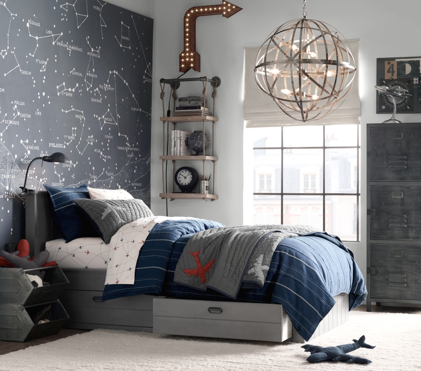 Space... If a child is interested in everything related to space, then you can create a starry sky on the ceiling in the children's room for a boy using special lighting or wallpaper glowing in the dark. You can buy a chandelier in the form of a flying saucer, a bed that looks like a spaceship in a child's room for a boy, create an appropriate print on the textiles of the bed and curtains, use steel-colored fittings for furniture. One of the walls can be made in the form of a parade of planets using photo wallpaper.