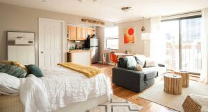 The next step is to choose the right furniture. It is able to emphasize the colors of work surfaces. Moreover, it is not only the color of the furniture that is important, but also its design and location. The limited space prevents the use of bulky wardrobes and beds in a studio apartment. In this case, the way out of the situation is to use compact, built-in furniture. It is smaller and transformable, making it more versatile than standard designs.