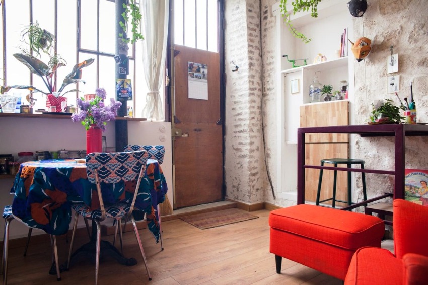 The bedroom formed by zoning can accommodate a full double bed with a table and a sofa for relaxation