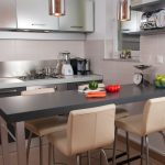 Often the kitchen is part of the common room. In such a situation, the most often used typeface is the letter "G". If there is enough space for the installation of kitchen furniture, then it is recommended to think about lengthening the countertop or installing a bar counter. But still, preference should be given to the linear arrangement of furniture and household appliances.