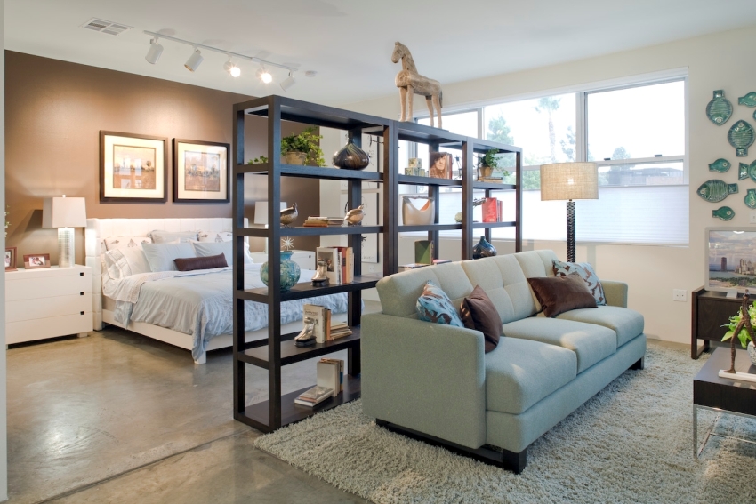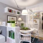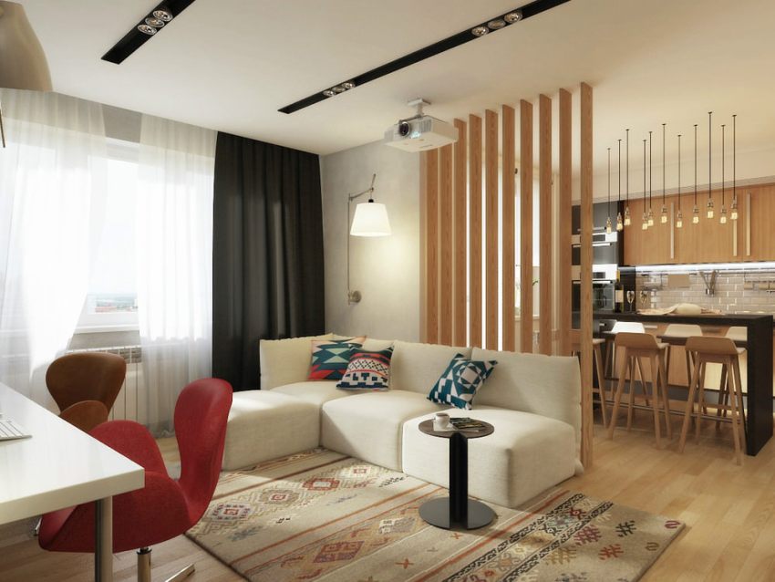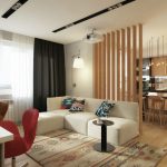 In turn, a segment for sleeping and resting can be distinguished using a regular carpet. For the kitchen area, experts recommend choosing LED lighting. The remaining area will be covered with a chandelier. When it comes to dividing zones for sleeping and working, there are two main options for this. The first of them takes into account the design of the room in the form of a living room. In this case, a folding sofa will serve as a place to sleep. The main advantage of this method is the most expedient use of the floor space.