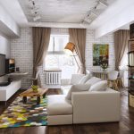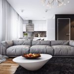 If you wish, you can add a part of the corridor space to the living room and thus increase its area. It is recommended to choose compact and functional furniture for the main room. When buying it, the number of people living in the apartment is also taken into account, as well as their needs.