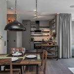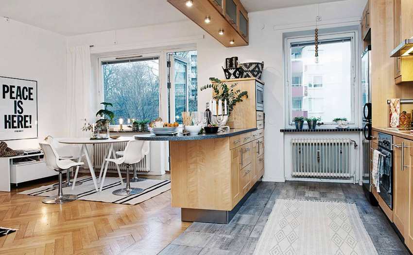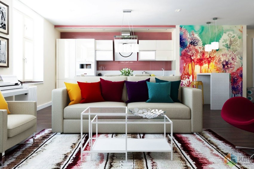 By combining the kitchen with the living room, you can get a huge studio room, which must be divided into zones