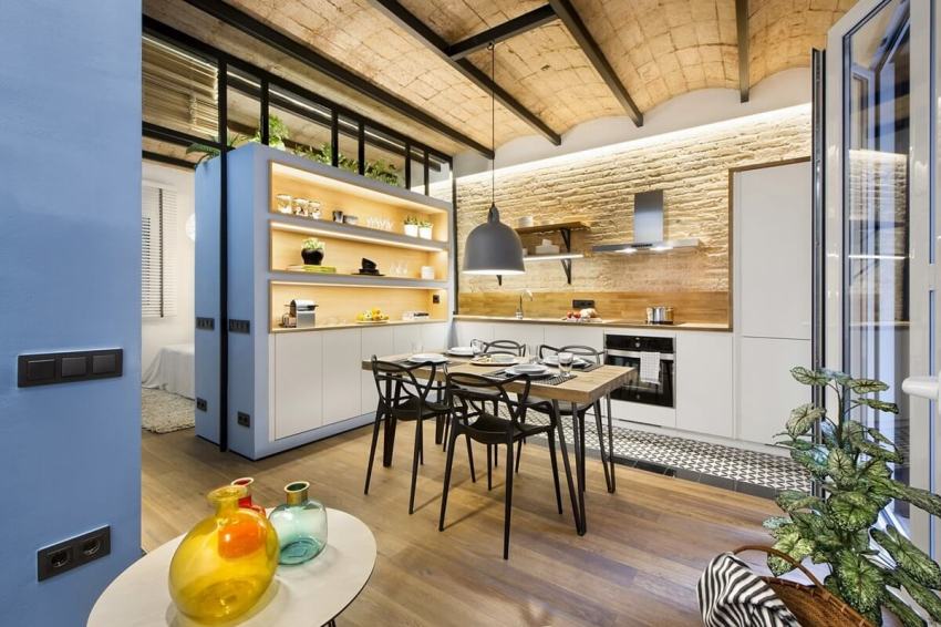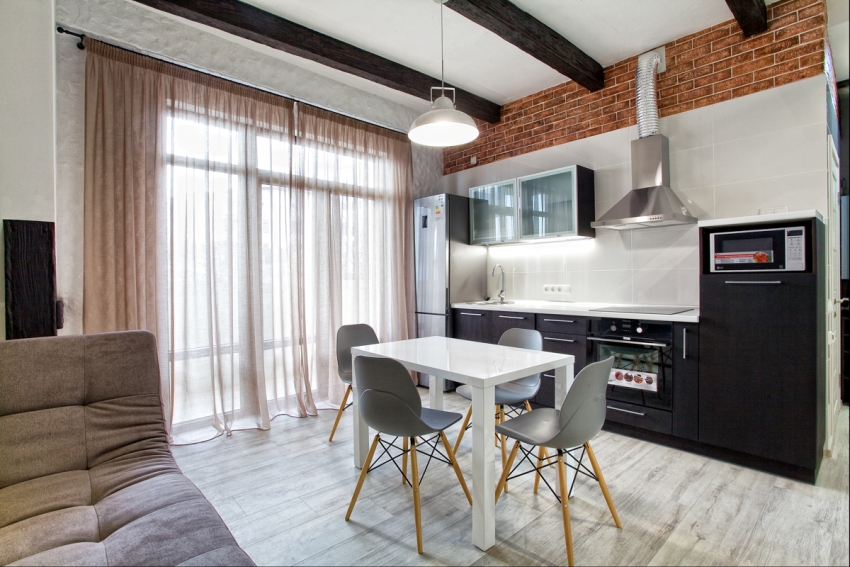 Drawing up a kitchen design in a one-room apartment is not an easy task. Quite often, designers resort to non-standard solutions. For example, an elongated tabletop or even a window sill can be used as a place for meals.