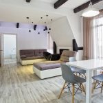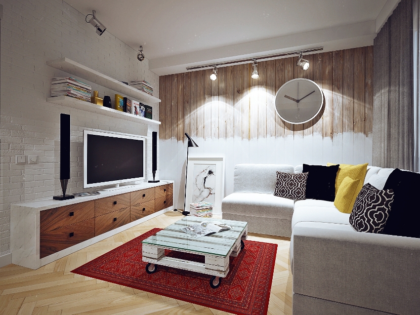 When choosing the design of a small one-room apartment, you must also carefully consider the choice of flooring. It can be laminate or tiles. Experts advise using wide boards or large tiles. You can lay a carpet on the floor, which will help room zoning.