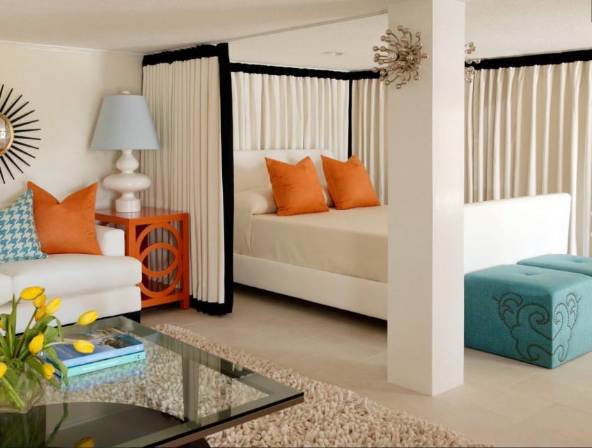 Let's consider some useful tips that allow you to create a competent design inside a one-room dwelling. First of all, you should remember that the interior is best designed in a light, "airy" style. To do this, it is necessary to use such elements as: partitions made of translucent fabric of light shades, mirrors, gloss and elongated decorative elements (vases, floor lamps, etc.).
