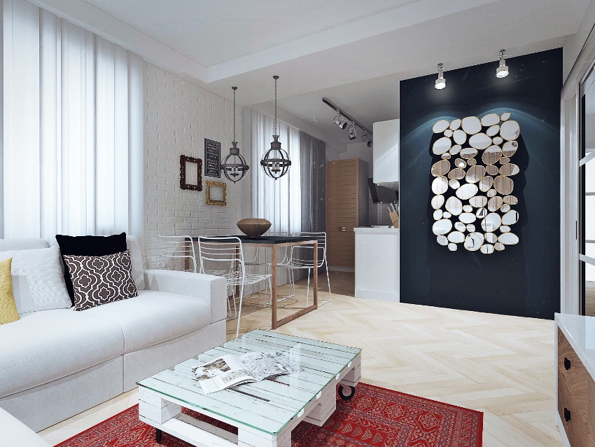 Consider several common options that will increase the space of an apartment by decorating. Redevelopment of doorways into arches allows you to visually expand the apartment. The same applies to the organization of rounded partition walls that separate individual zones. In addition, this solution looks stylish and modern. Designers also recommend combining different lighting options in a room. Separate areas can be highlighted with wallpaper, textured tiles or patterns. When choosing a room design in a one-room apartment, one should not be afraid of original ideas.