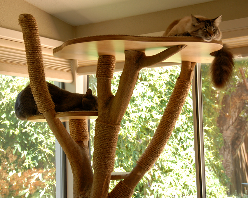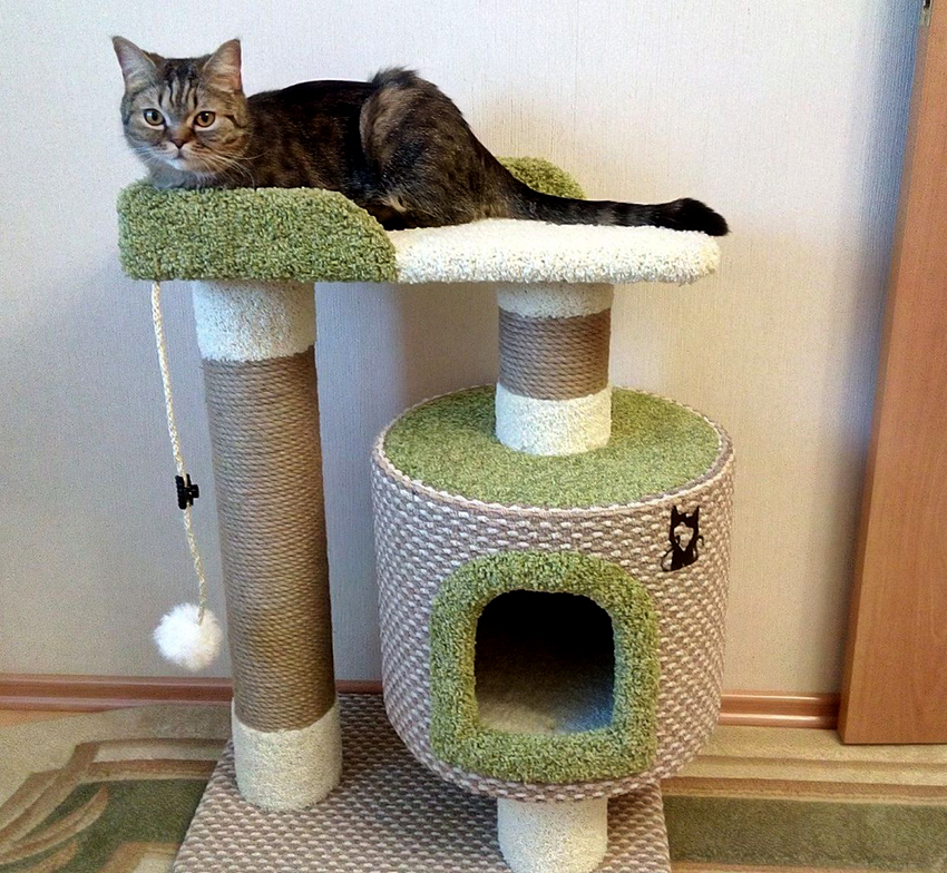 Playful pets need a place where they can throw out their energy, run, tinker and not be punished by their owner. To do this, next to the main covered dwelling, it is advised to fix posts of different heights entwined with twine, the tops of which are decorated with small tabletops for jumping.In this case, you can make play complexes for cats with your own hands or purchase a ready-made design at a pet store. However, it should be borne in mind that the price of complex structures can reach several tens of thousands of rubles.