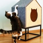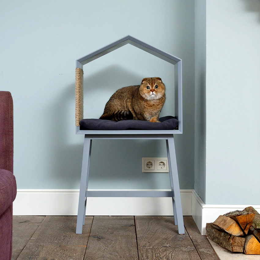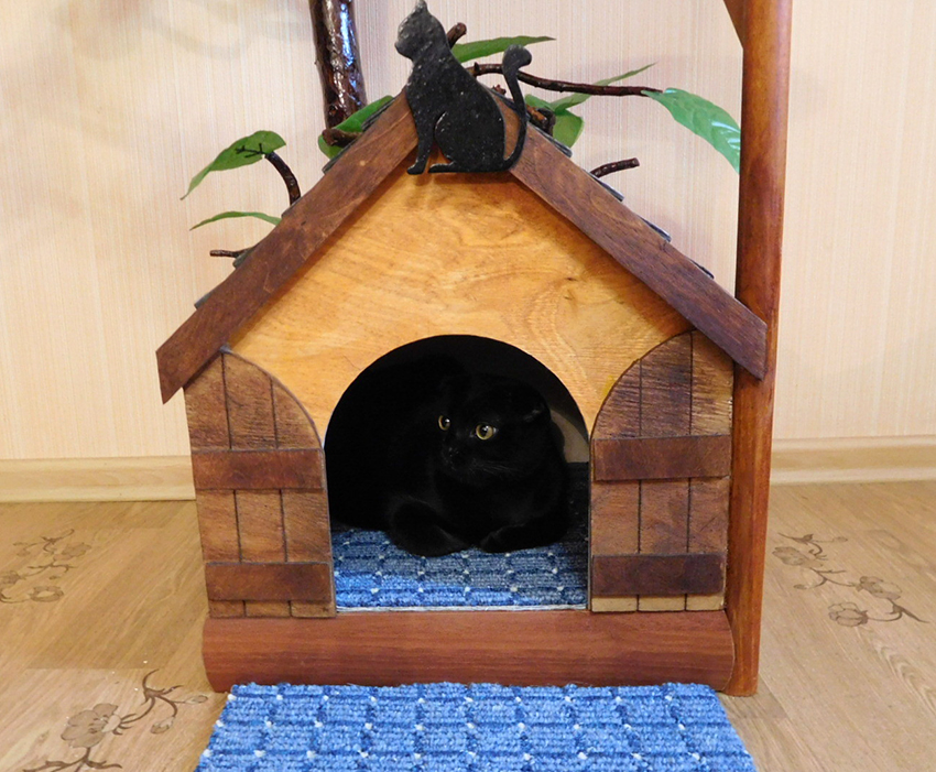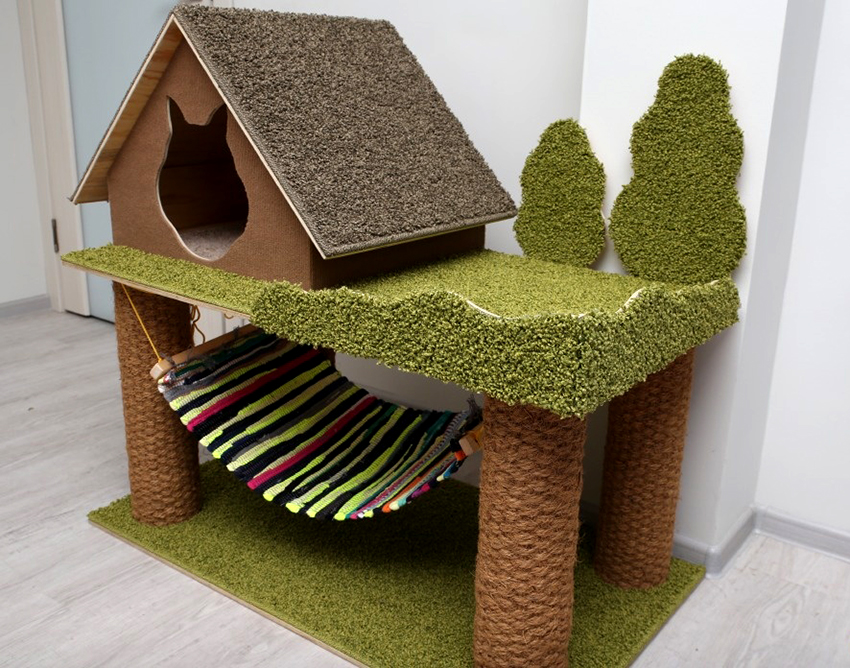 - As a playable element, you can attach a small springboard made of wood or textiles to the house. In this case, the cat will have an additional structure with which he can climb up.