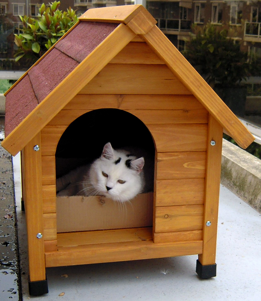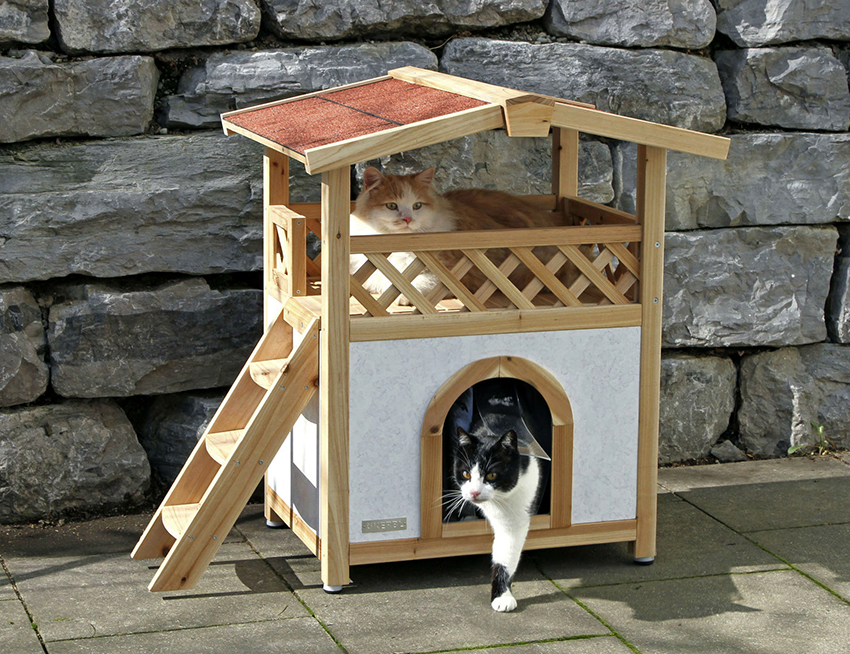It is better to cover the outdoor cat house with a material that does not allow moisture and precipitation to pass through. If a dwelling is planned for another animal at the top, for convenience, the structure should be supplemented with a ladder. You can equip one side of the house with a scratching post, and put a soft bedding or mattress inside. In addition to the standard rectangular version, triangular houses are often made designed for installation in a corner space.