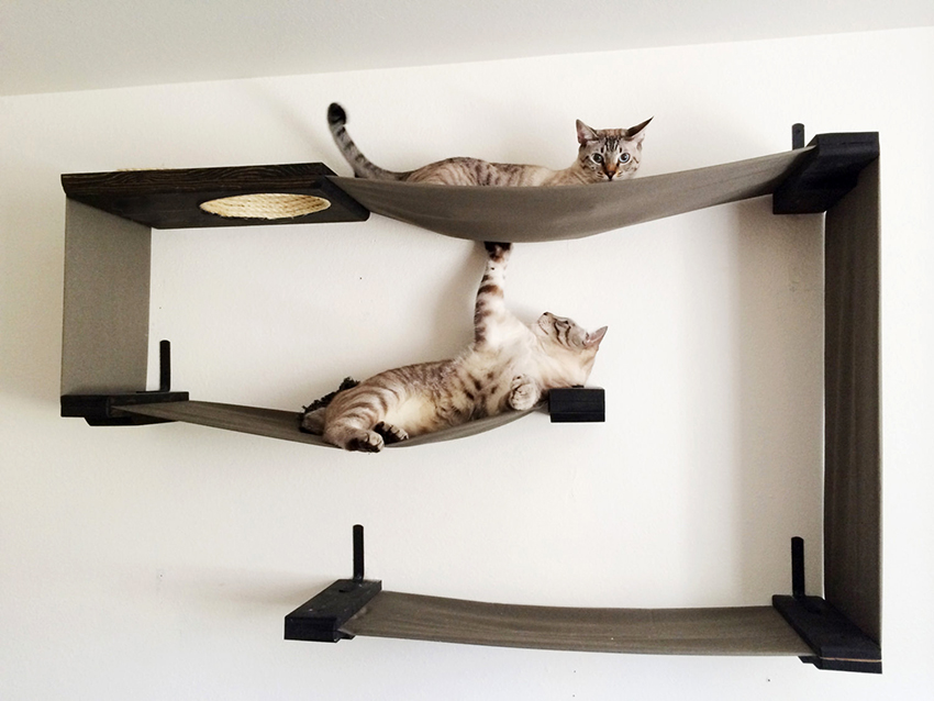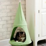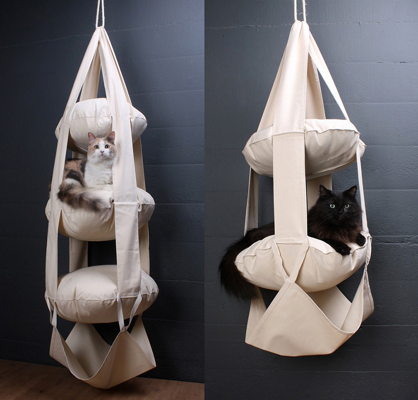 If you look at the photos of houses for cats, you can pay attention to the fact that simple hammocks, couches, which are fixed in any convenient place and move if necessary, are very popular. Fastening mainly occurs thanks to buttons, Velcro, loops, ties or carabiners holding the structure from four corners. In this case, the product can be made in two versions: