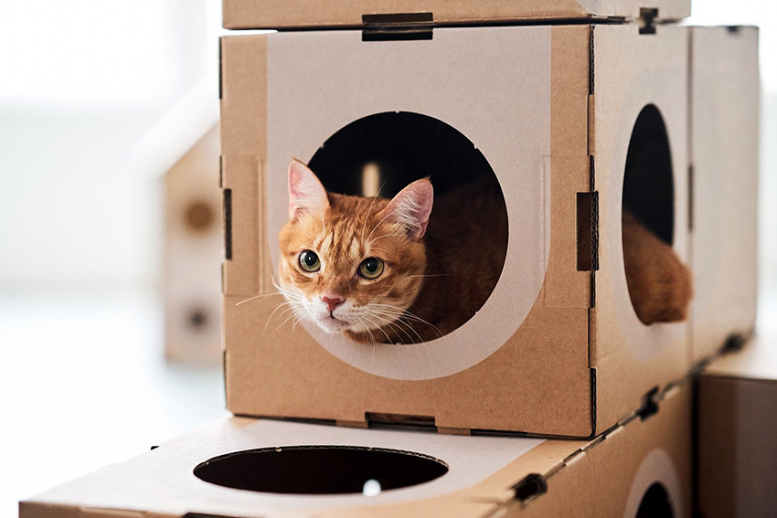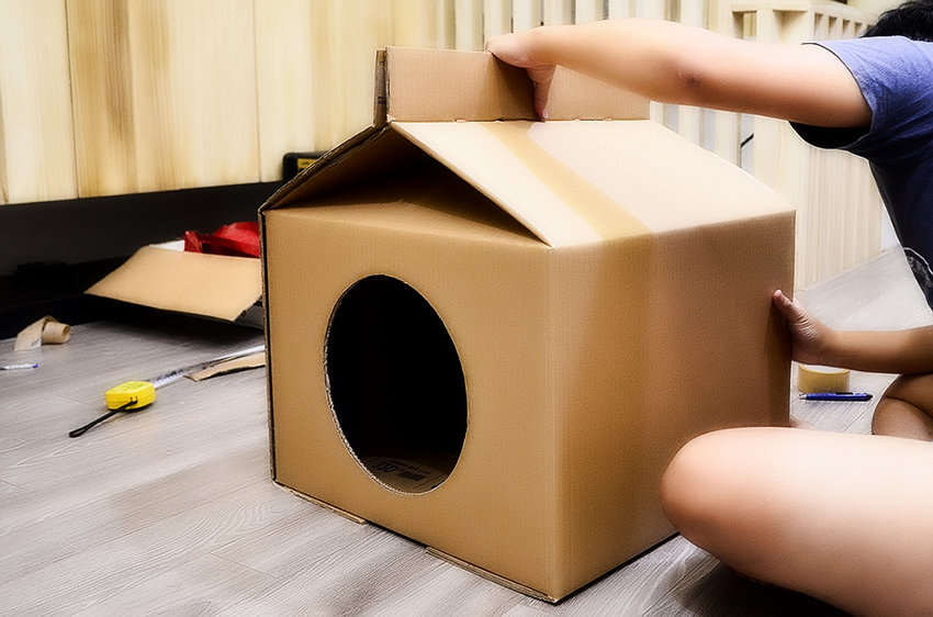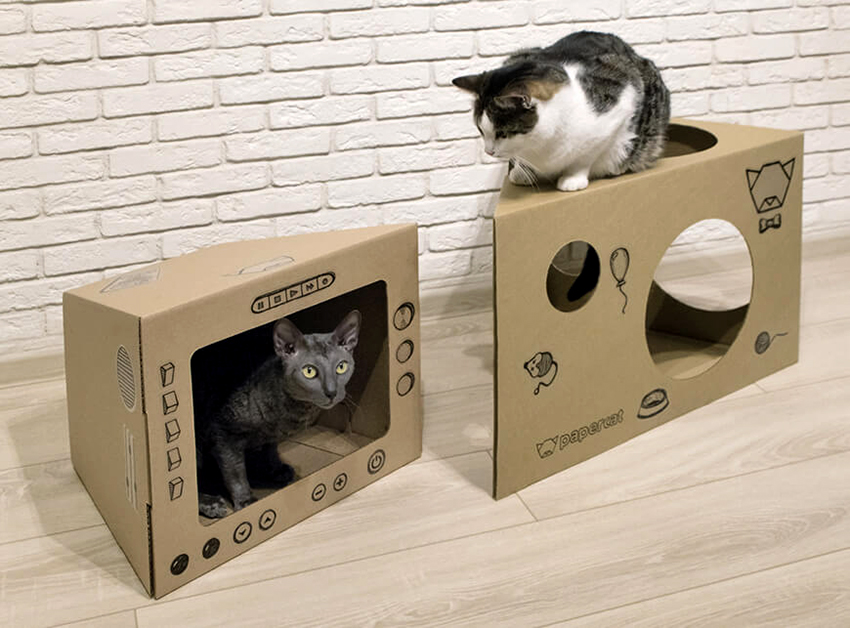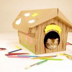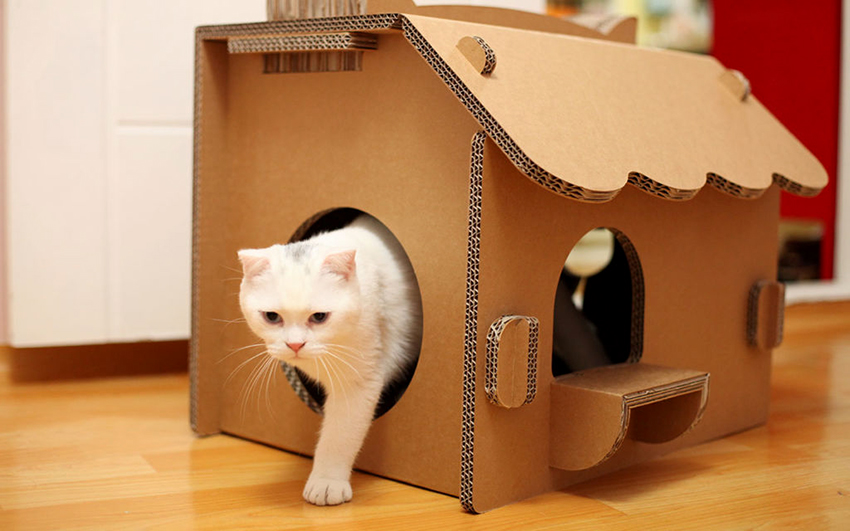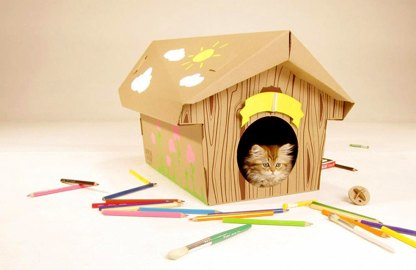 If cardboard houses for cats are intended for outdoor use, the floor and walls must be additionally reinforced and insulated with polystyrene foam so that warm air is better retained inside the dwelling and does not get cold from the ground. At the end of the main work, you can think about installing additional accessories, for example, toys, ribbons, threads, sparkles, etc.