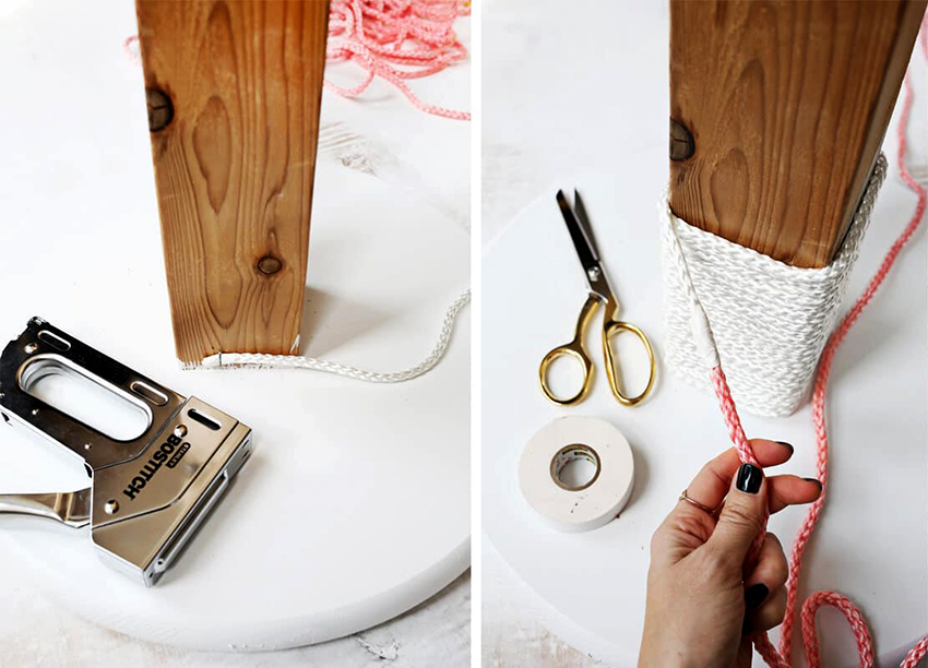 - Before wrapping vertical elements with hemp and jute twine, apply plenty of PVA glue on them, and after wrapping, additionally tap the surfaces with a rubber hammer.