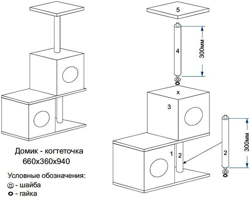 The best option for fasteners is PVA glue, which, after drying, does not emit any odors and is normally tolerated by cats. It is permissible to use glue to secure the rope and upholstery. Shelves and other elements of the house are nailed with ordinary nails.