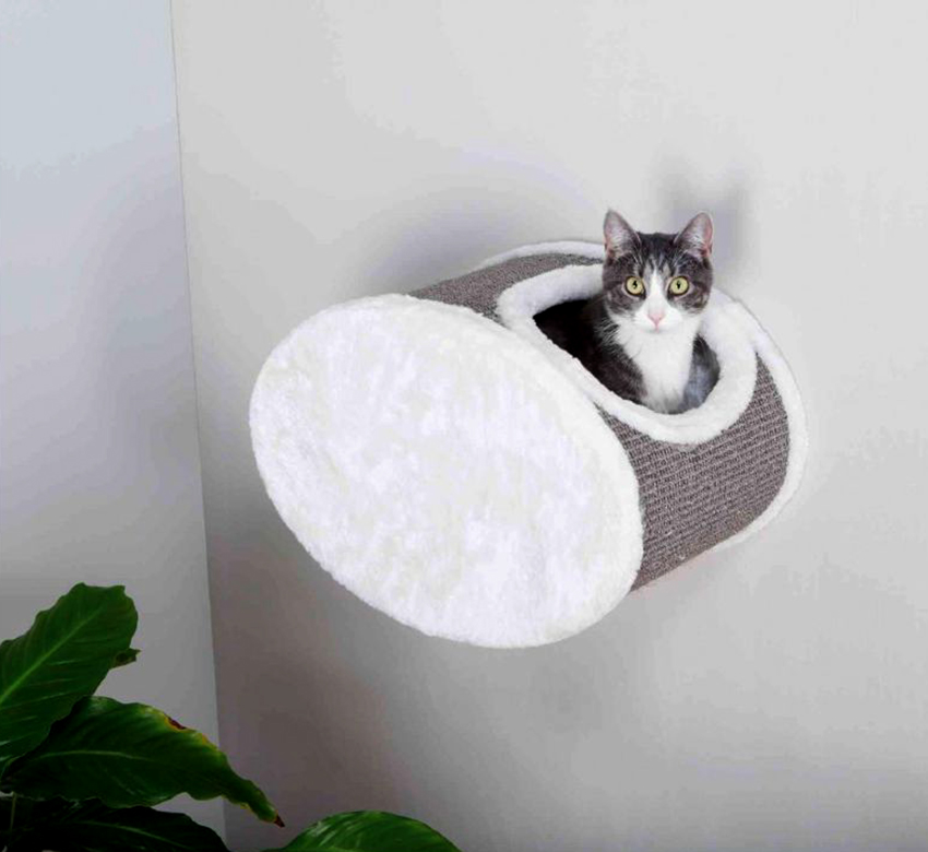 To save space in a small room, many owners prefer wall-mounted dwellings for pets, especially if we take into account the fact that all cats love to occupy a high-positioned space in an apartment. A solid base structure is usually anchored to the wall surface between two rungs and is a shelf. For greater comfort, the surface is upholstered with textiles or other material pleasant to the touch. To make it easy for a cat to climb into the house, you should place several comfortable and wide steps on the wall or make a corner house with several floors.